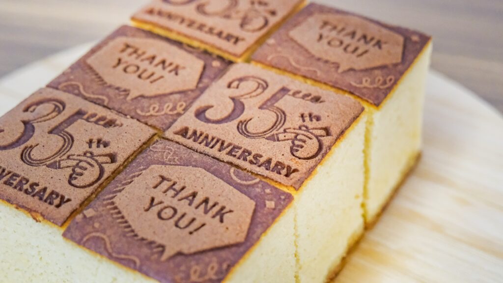 また、弊社の35周年特設ページに掲載している周年記念動画を会場でも上映しました。特設ページでは、代表のご挨拶や周年ロゴのご紹介もご覧いただけます。また、周年パーティーのお土産として、オリジナルカステラをお渡ししました。