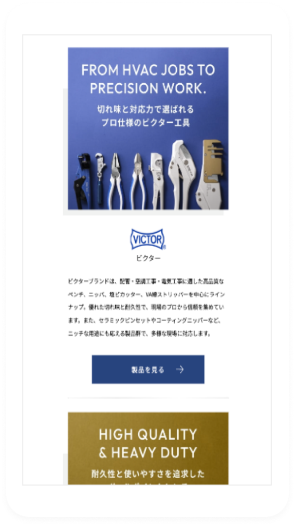 国内の様々な⼯具メーカーをグループ傘下に収められていましたが、各ブランドのサイトやイメージが統一されていないという課題がありました。そこで議論を重ね、各ブランドのイメージを再構築するフォトディレクションを行い、統一感のある意匠(デザイン)を開発しました。